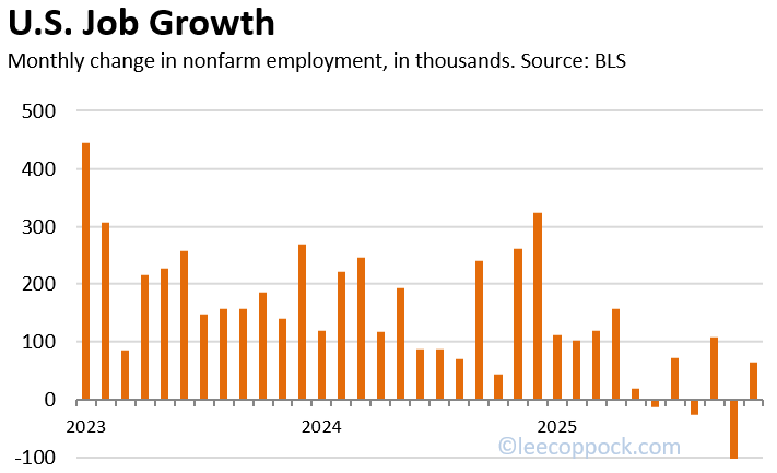 Part of the reason the unemployment rate is rising is that overall jobs growth has slowed considerably. The U.S. economy generally adds about 200,000 jobs in a normal healthy month. But Since April of this year, jobs growth has been essentially flat. Today’s report estimates that 64,000 jobs were added in November, but this comes on the heels of new estimates that there was a substantial decline in October, with total nonfarm employment falling by 105,000 jobs. The Figure below shows monthly changes in nonfarm U.S. employment over the past three years. Notice the overall decline in 2025, especially since April.